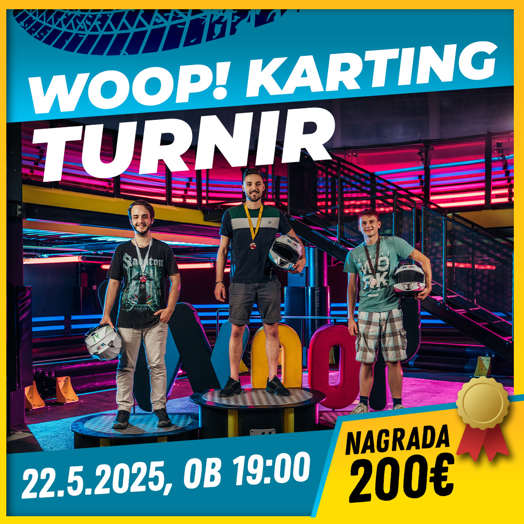 Dirkali bomo v četrtek, 22.5.2025, od 19 dalje, akcijska cena kotizacije pa znaša 32,90 € na osebo in vključuje prijavnino na turnir, najmanj dve in največ štiri vožnji ter pogostitev s pizzami. Nagrada za zmagovalca je 200 € v WOOP! vrednostnih bonih.